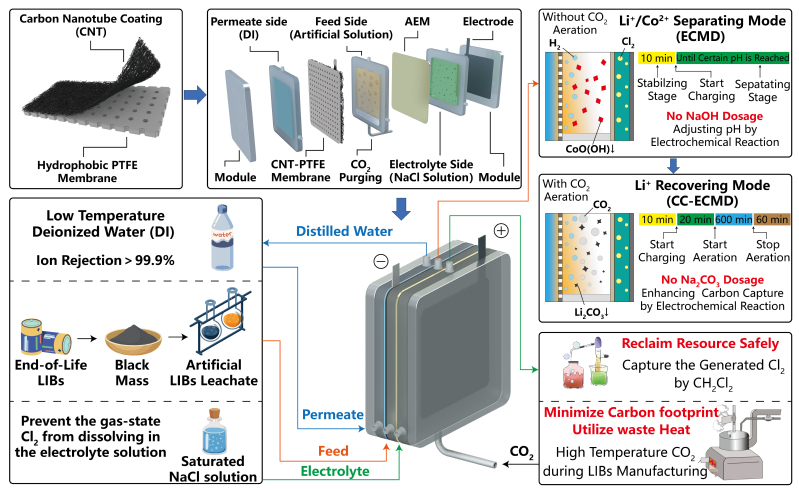近期,环境生态学院教师姜龙杰及其团队在江苏省生态环境保护城乡水环境治理低碳发展工程技术中心的支持下开发了一套全新的膜法退役LIBs回收工艺,通过在膜蒸馏组件内原位耦合电化学反应和碳捕集过程,避免了传统湿法工艺中NaOH和Na2CO3等试剂的大量投加,在创造可观碳汇的同时,实现了高纯度产物的分别回收,其中CoO(OH)和Li2CO3的纯度分别可达99.12%和99.81%。在此基础上,团队还基于安托因方程、法拉第方程以及双膜吸收理论,量化了工艺内的物质迁移转化行为,构建了原料液组分的动态平衡数学模型,从而指导实现了工艺的长效运行。