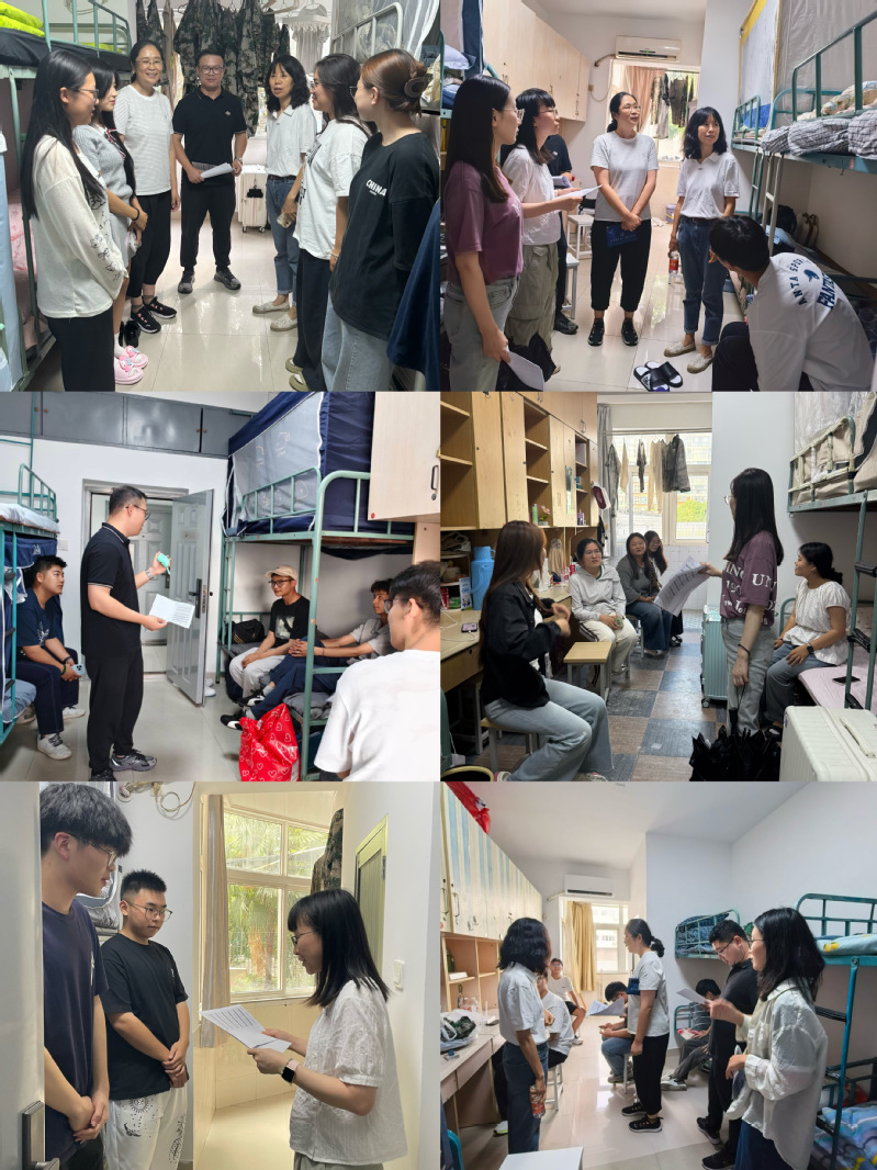 下午三点半,党总支书记段英、副书记杨丹带队走访新生宿舍,与同学们亲切交谈。“从哪里来?”“住宿是否习惯?”“有没有什么困难?”一句句关怀温暖的话语冲淡了新同学离家的愁绪;“插座离人要断电”“陌生链接别打开”“规律作息适度运动”,交谈中反复叮嘱同学们注意用电安全、防范诈骗、保持卫生,建立融洽的宿舍氛围。同学们表示要尽快适应集体生活,投入到大学的学习生活中去。