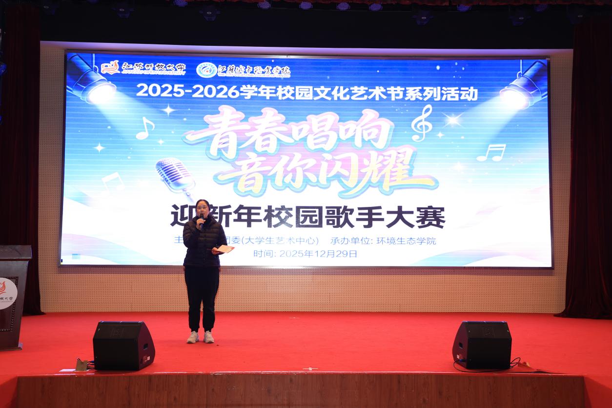 活动伊始,环境生态学院党总支副书记杨丹代表承办单位致辞。她言语真挚,满含对学子们的期许:“青春的歌声最动人,追梦的姿态最昂扬。愿每一位选手都能放声高歌,用旋律传递热爱,用歌声诠释担当,展现新时代青年学子的蓬勃朝气与奋进风貌。” 简短的寄语,点燃了现场的热烈氛围,也为选手们注入了满满的信心。