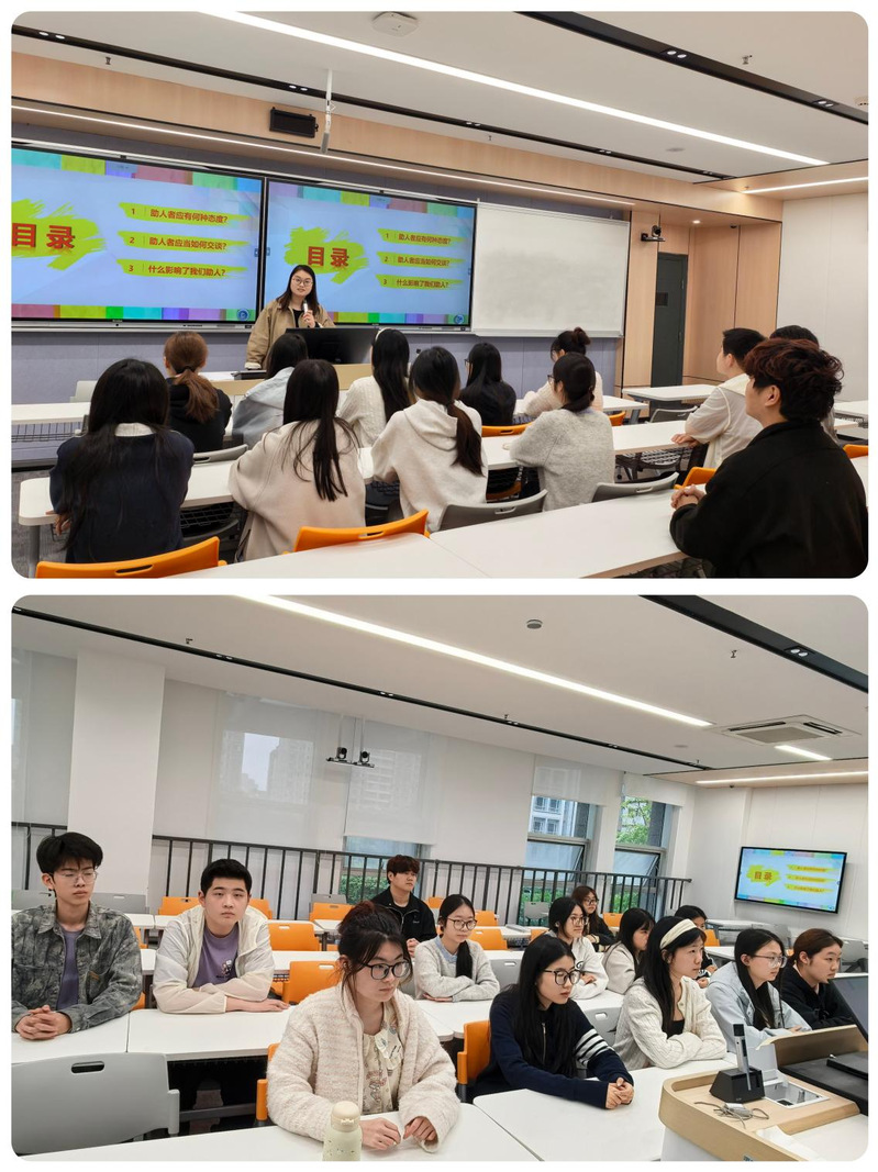 姚伟丽老师围绕助人态度、工作原则与沟通实务三个层面展开讲授,系统解读了朋辈心理辅导的核心要义。她指出,心理委员应始终秉持尊重、真诚、共情、积极关注的基本态度,在耐心倾听与用心陪伴中把握帮扶尺度,以严谨稳妥、温暖有力的方式为同学提供有效心理支持。培训重点聚焦倾听、表达、提问、反馈四项关键沟通技能,结合宿舍相处、日常交往、情绪疏导等校园常见情境,通过案例对比与情景分析,帮助在场学生掌握规范高效的沟通方法。针对“害怕说错话”“不知如何回应”等实际困惑,姚老师逐一解答并强调,真诚的态度远胜于华丽的言辞。同时,她提醒大家注重自我关怀与情绪调适,遇到超出自身能力范畴的情况须及时上报。