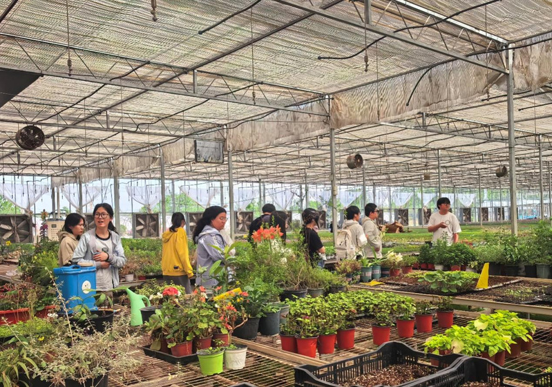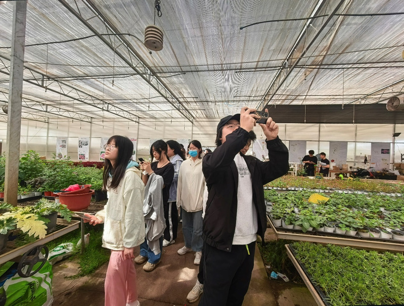基地技术人员从基地整体布局、生产运营模式、智能养护设施设备到核心技术应用等多方面为师生们进行了系统翔实的讲解。从繁殖育苗、苗期管理到上盆定植、花期调控、包装销售,完整的生产流程展示让同学们对课堂上的理论知识有了具象化认知。学生们不时就感兴趣的问题与技术人员提问交流。基地技术人员还结合自身从业经历,分享了花卉生产中的实操经验与行业发展趋势。